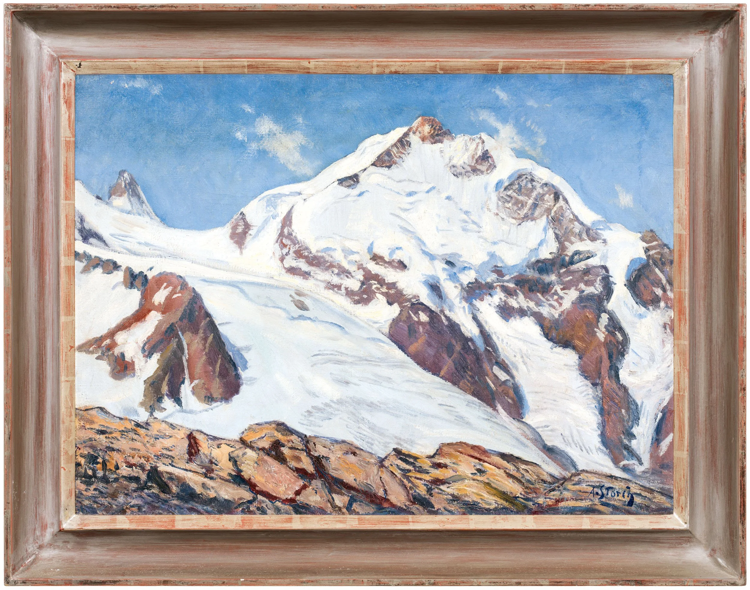 Der Piz Bernina ist der einzige Viertausender der Ostalpen. Er liegt im Grenzgebiet zwischen der Schweiz und Italien. Storch-Alberti hat hier eine großartige Ansicht dieses Gletschergipfels geschaffen. Er erreicht eine unglaubliche Tiefenentwicklung im Bild. Der Berg ist von kleinen Wolkenschwaden begleitet und wirkt dadurch etwas entrückt. Der Betrachter steht am Rande des Berges bei einem Felsen und ist von der Ruhe und Macht dieses Anblicks gebannt.